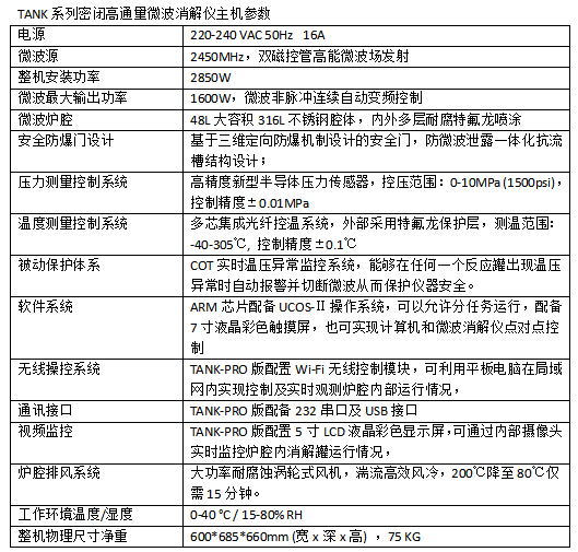 TANK使用ARM芯片配備UCOS-Ⅱ操作系統(tǒng),運(yùn)行穩(wěn)定可靠。采用7寸液晶彩色觸摸屏,觸控操作流暢簡(jiǎn)便。頁(yè)面實(shí)時(shí)顯示工作狀態(tài)及溫壓變化曲線(xiàn)。內(nèi)置專(zhuān)家方法庫(kù),也可自行編輯及存儲(chǔ)用戶(hù)方法。內(nèi)置COT實(shí)時(shí)溫壓異常監(jiān)控系統(tǒng)能夠在任何一個(gè)反應(yīng)罐出現(xiàn)溫壓異常時(shí)自動(dòng)報(bào)警并切斷微波從而保護(hù)儀器安全。PRO版獨(dú)有Wi-Fi無(wú)線(xiàn)控制模塊,既可實(shí)現(xiàn)計(jì)算機(jī)和微波消解儀點(diǎn)對(duì)點(diǎn)的控制,也可利用平板電腦等在局域網(wǎng)內(nèi)實(shí)現(xiàn)控制及實(shí)時(shí)觀(guān)測(cè),使用戶(hù)“舒心實(shí)驗(yàn)、安全實(shí)驗(yàn)”。PRO版亦采用雙屏設(shè)計(jì),另配5寸LCD液晶彩色顯示屏通過(guò)內(nèi)部攝像頭實(shí)時(shí)監(jiān)控爐腔內(nèi)消解罐運(yùn)行情況。
